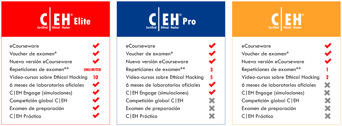 * Voucher de examen: EC-Council ahora incluye un cupón de repetición de examen gratuito para cada paquete de material didáctico: 1 repetición de examen para el material didáctico C|EH estándar, 3 repeticiones de examen para C|EH Pro y repeticiones ilimitadas en C|EH Elite.